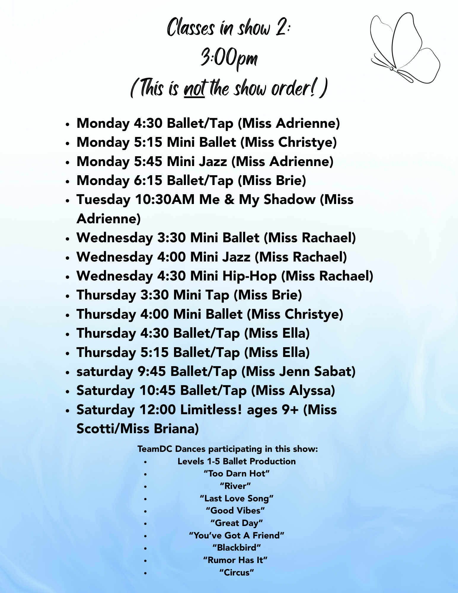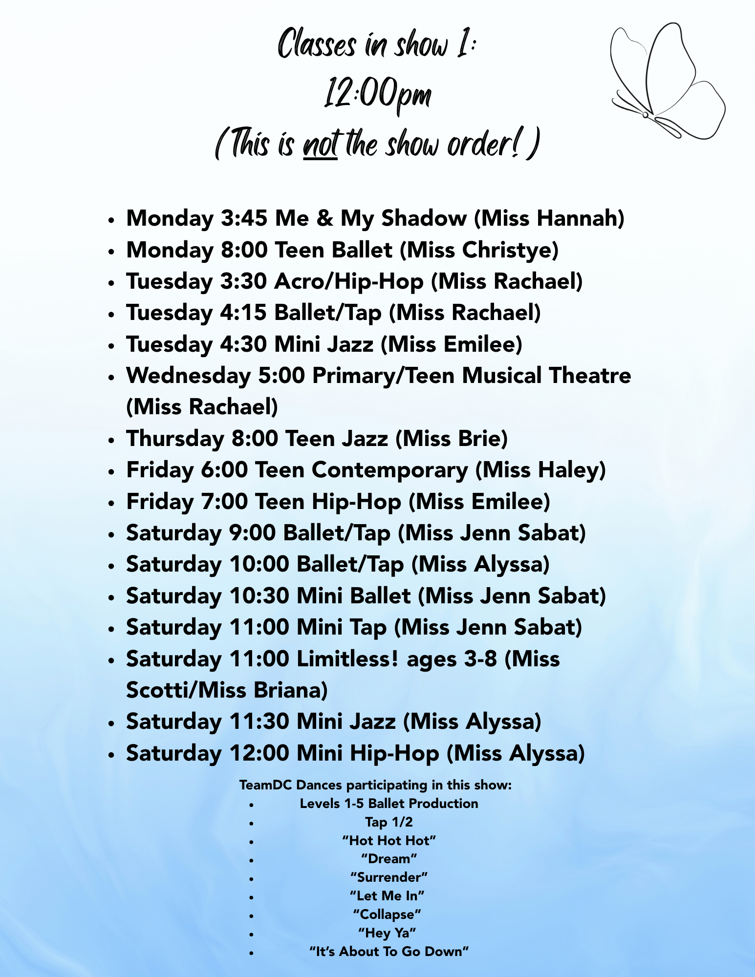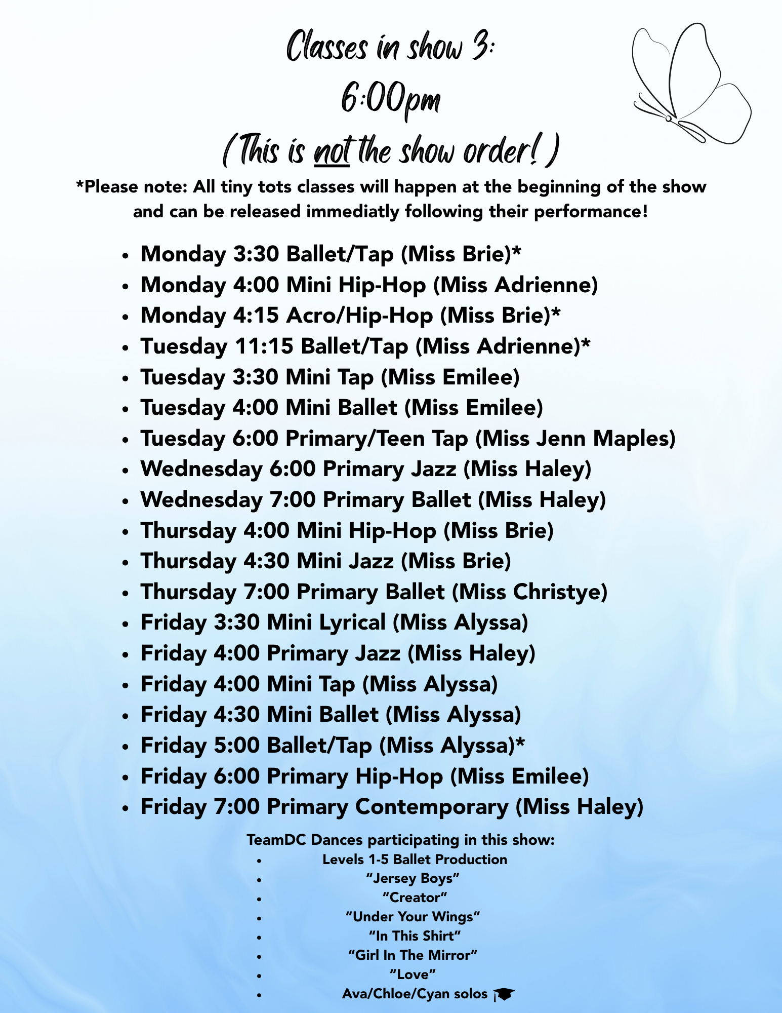 Please refer to the below lists to find out which show(s) your dancer(s) will be performing in.