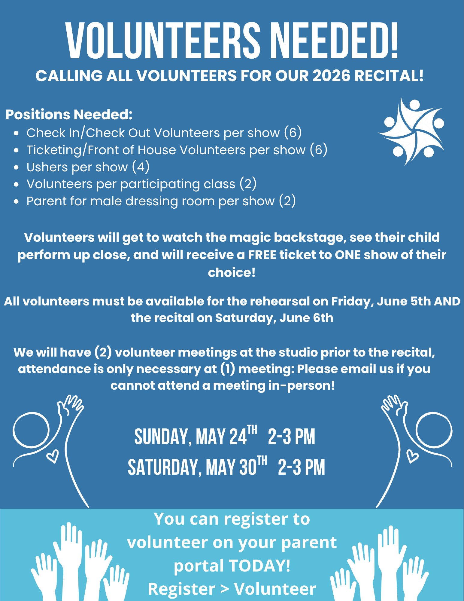All key recital details—including dress rehearsal schedules, ticketing, costume information, and venue details—will be updated here as we finalize plans.